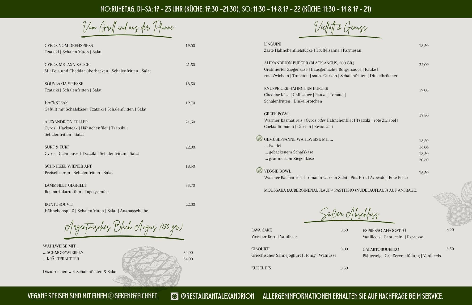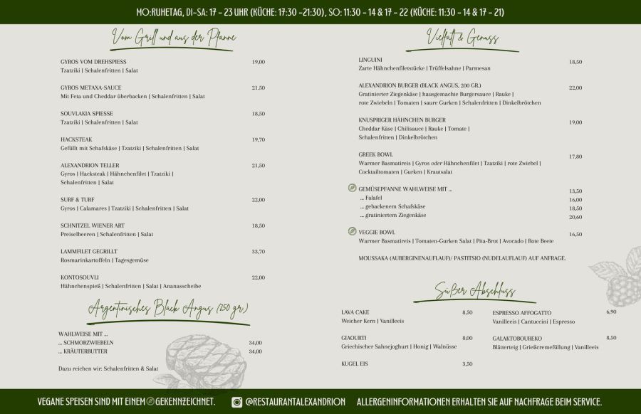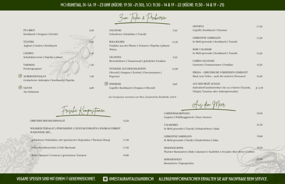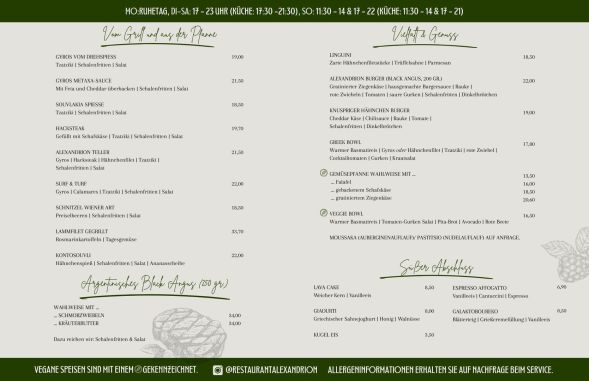 In unserer Speisekarte findet ihr alles, was die griechische Küche zu bieten hat...und noch mehr! Gerne bereiten wir frischen Fisch oder verschiedene Fleischspezialitäten wie Tomahawk-Steaks, australisches Roast Beef, Seezunge und weiteres auf Vorbestellung für euch zu. Dafür benötigen wir eine Anlaufzeit von mindestens zwei Tagen. Sprecht uns hierfür gerne an.