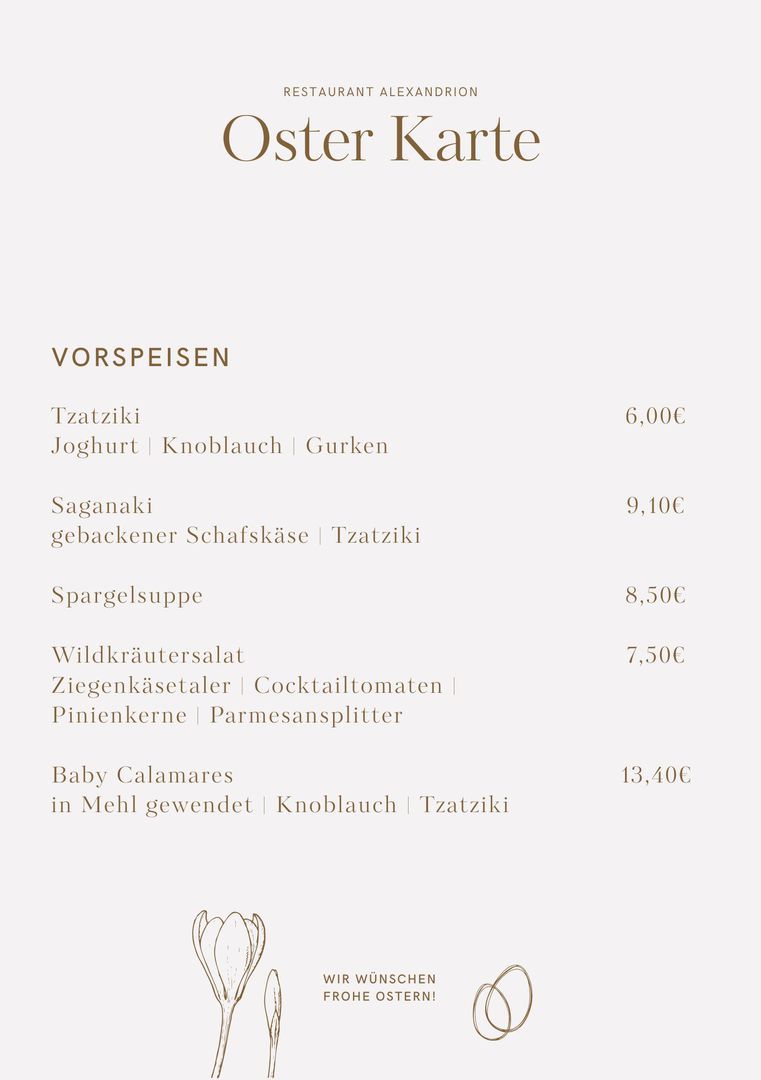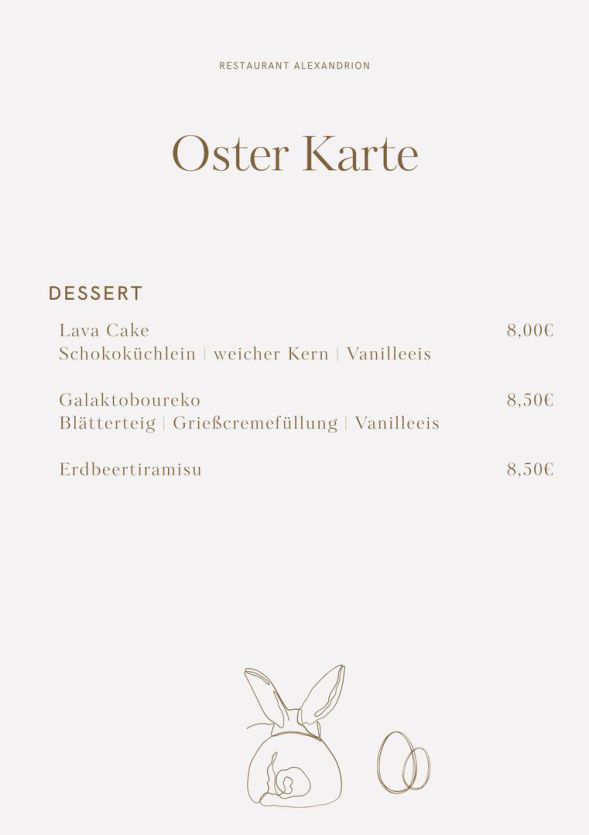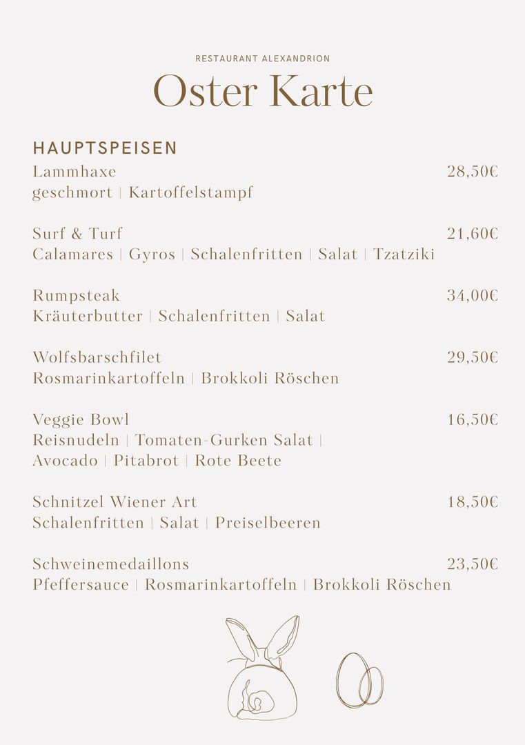 Unsere Osterkarte bietet euch eine liebevoll ausgewählte Vielfalt an festlichen Vor-, Haupt- und Nachspeisen. Diese Spezialkarte gilt am 05. und 06. April und lädt euch ein, die Feiertage genussvoll und entspannt bei uns zu verbringen.