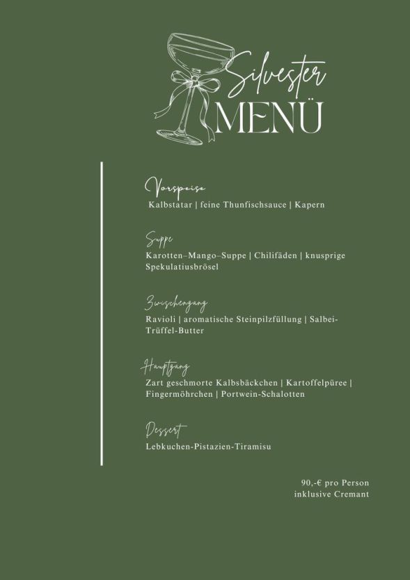 Unser Silvestermenü steht nun fest und verspricht einen Abend voller Genuss und festlicher Aromen. Der Abend endet gegen 22:00 Uhr – perfekt, um anschließend entspannt weiterzufeiern oder den Jahreswechsel ruhig ausklingen zu lassen.