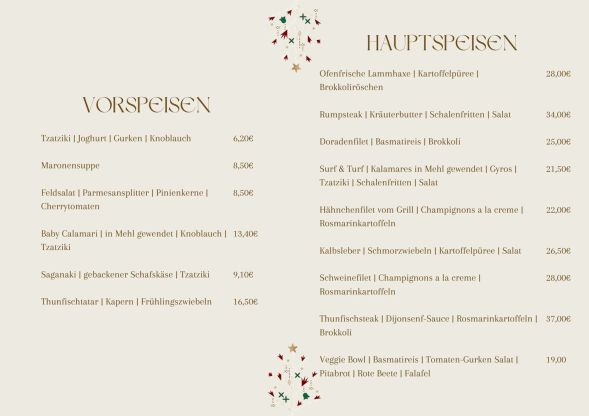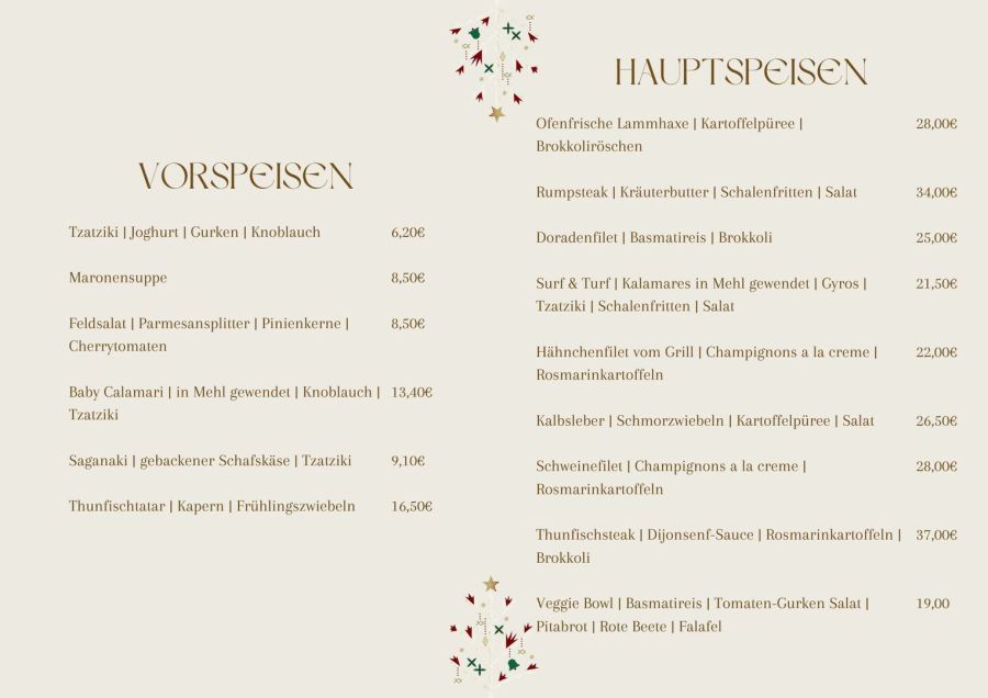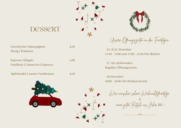 Unsere Weihnachtskarte bietet euch eine liebevoll ausgewählte Vielfalt an festlichen Vor-, Haupt- und Nachspeisen. Diese Spezialkarte gilt vom 25. bis einschließlich 30. Dezember und lädt euch ein, die Feiertage genussvoll und entspannt bei uns zu verbringen.